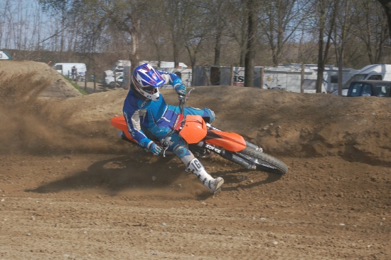 Wäre gerne noch einen weiteren Tag geblieben, doch die hatten ein Rennen am Ostermontag und so fuhren wir Sonntag Abend nach Cadrezate und hatten uns dort mit Manu verabredet. Übernachten durften wir auf einem Firmenparkplatz, der zum Glück beleuchtet war. Nach einer Woche ohne Strom waren unsere Batterien im Wohnwagen und im Transporter leer, und das kleine Teelicht hatte es auch nicht ´rausgerissen. Die Anlage war genauso gut wie die Strecke, top präpariert und gewässert, mit 20 Euronen allerdings auch die teuerste Strecke - und endlich ´mal eine warme Dusche - herrlich ! Das Fahren war geil, besonders mit Manu am Hinterrad - Mann, der puscht Dich ! Gegen seine 450er musste ich voll ´drauf halten, und ein kleiner Fehler und vorbei war er und weg. Spät nachmittags haben wir uns dann auf den Heimweg gemacht.