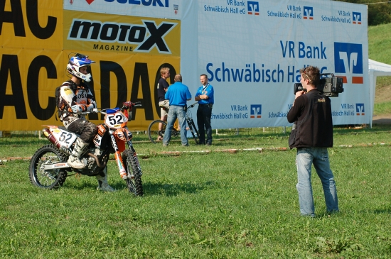 Nach dem das letzte Tiefdruckgebiet seinen Wassergehalt über Gaildorf entleerte, war die Strecke am Samstag in einem schön weichen Zustand. Nachdem die 85er die Stecke eingefahren hatten war das freie Training zwar noch etwas schmierig, aber gut zu fahren. Im Pflichttraining waren dann Top-Bedingungen, weicher griffiger Boden und gute Anlieger. So schaffte ich in der 6-ten Runde eine sehr gute Zeit, nur um in Runde 8 mich nochmals um 2 hundertstel zu verbessern - hätte ich mir komplett schenken können. Am Ende Platz 6 und damit 11-ter Startplatz. Nachdem alles gelaufen war und die Maschinen schon wieder für den nächsten Tag hergerichtet waren, durfte ich noch ein paar Runden mit der Helmkamera fahren - hättet mal meinen Mech (=Dad) hören sollen, wie der geflucht hat (hihihi).
