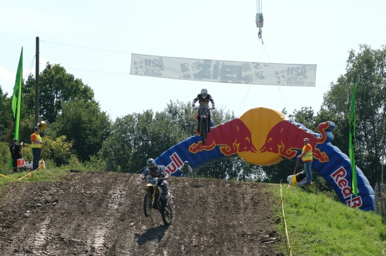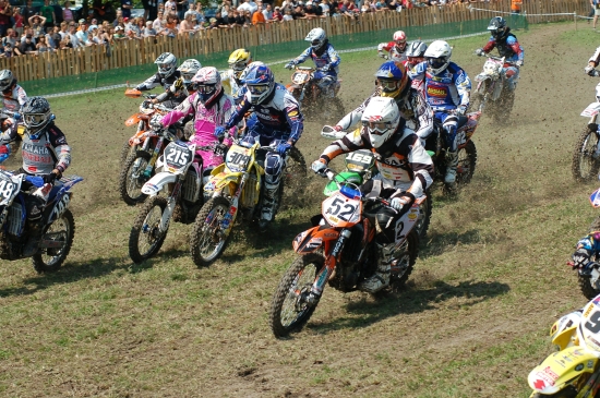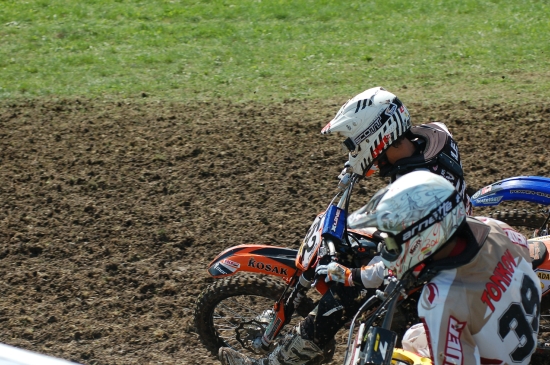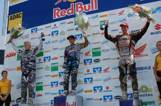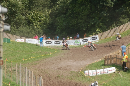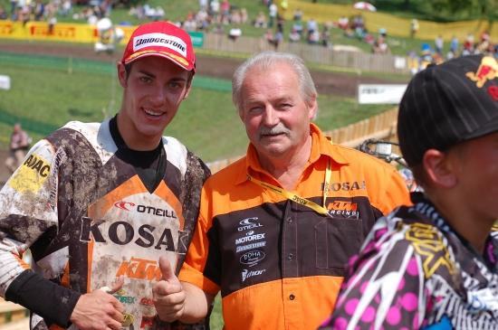 Am Sonntag waren beste Bedingungen, nachdem der MSC abends gewässert hatte. So fuhr ich im Warmup fast 2 Sekunden schneller als der 2-te, Filip Thuresson - leider war dies noch nicht das Rennen. Beim Start etwas nervös passte dann alles, so bog ich hinter Ken in die Startkurve, und da ich nicht die innerste Spur hatte verlor ich 2 Plätze bis zur Rechtskurve, da hatte es in meiner Rille vor mir gestockt und schon wieder waren ein paar vorbei. Sch..., dachte ich, also fahr ich dann 'mal. Ich war super drauf und so erkämpfte ich mir Platz um Platz, zuletzt an Jorgensen und Heidecke (falls ich mich nicht täusche) vorbei und habe bis fast zur Spitze aufgeschlossen. Thuresson und Roczen waren vielleicht noch 20m weg, da bin ich in einer Kurve etwas aus dem Rythmus gekommen und wieder einige Meter verloren. Die letzten Runden habe ich meinen Platz gehalten und den Abstand zu Heidecke kontrolliert, mit 11 Sekunden auf Filip und 14s auf Ken war der 3-Platz mein bisher bestes Ergebnis bei den Youngstern. Mein Teamchef Herbert Kosak und das ganze Team haben sich mit mir riesig über dieses Ergebnis gefreut.