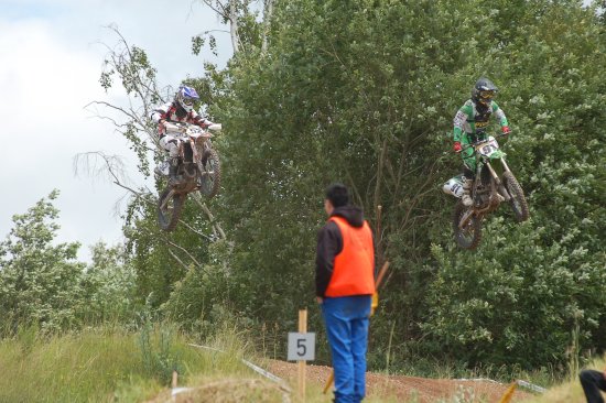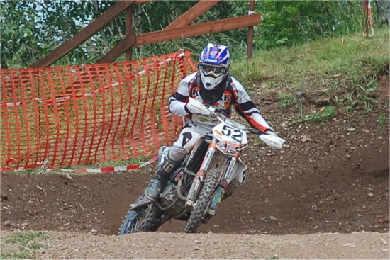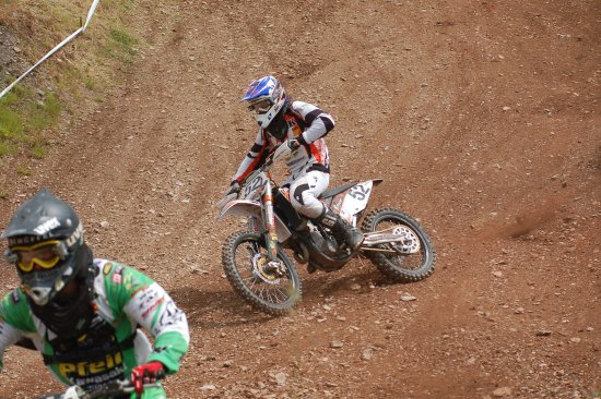 Der Start zum 2-ten Lauf war mit der 8-ten Position zwar etwas besser, dafür fand ich keinen Rythmus und verlor 2 Plätze. Damit nicht genug hat's mir in Runde 7 an dem Bergauf Sprung vor dem Zieltable das Hinterrad verschlagen und ich einen Abflug gemacht. Dann ist mein Teamkollege Dennis auf meine Maschine drauf und auch Lars, der dicht hinter uns war, ist auch noch rein und hat sich im Gegensatz zu Dennis abgelegt. Meine Maschine von den eigenen Kollegen plattgemacht! Plastkteile lagen rum, Rahmenheck krumm, und ich Schmerzen im Knie - das war das Ende meines 2-ten Laufs. Schade für Lars, den er lag bis dahin gut in den Punkten.