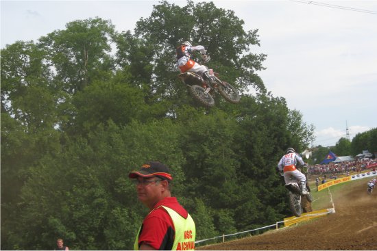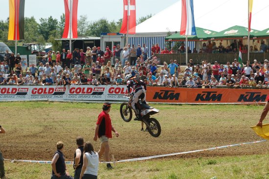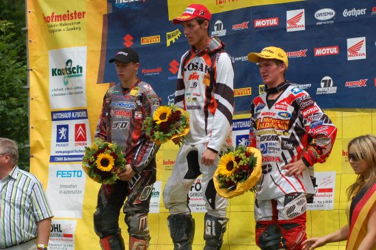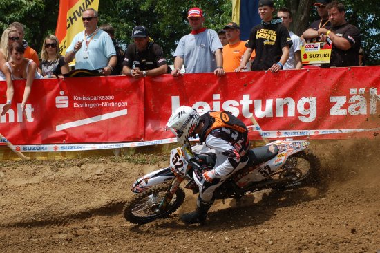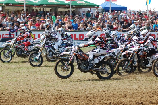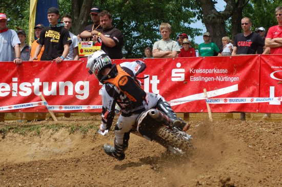 Der Start zum 2-ten Lauf war nicht ganz so gut, ich war auf gleicher Höhe mit meinen Gegnern rechts, die mir natürlich die Tür zu machten. Platz 10 oder 11 nach der ersten Runde war okay, ich konnte mich auch gleich ein paar Plätze verbessern. Am Hinterrad von Lars Reuther, meinem Teamkollegen angekommen, habe ich meine Maschine ausgebremst und erst durch Anschieben wieder zum Laufen bekommen. An 18-ter Stelle musste ich das Rennen wieder aufnehmen und wollte nur noch Schadensbegrenzung machen. Als ich dann bereits wieder 13-ter war und mit meinem nächsten Gegener auf Tuchfühlung, konnte ich meine Gänge nicht mehr schalten - mein Schalthebel hatte sich selbstständig gemacht und mich und meine Maschine verlassen! Im 2-ten Gang war es sinnlos, das Rennen fortzusetzen, und so fuhr ich total frustriert 'raus und beendete den 2-ten Lauf mit einem Nuller.