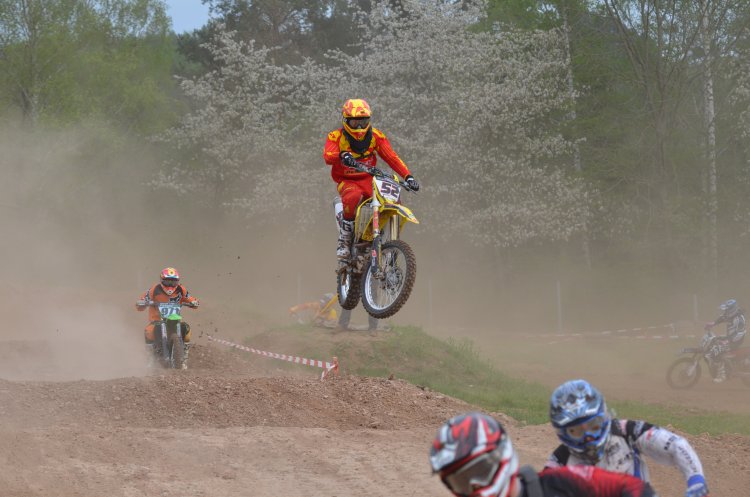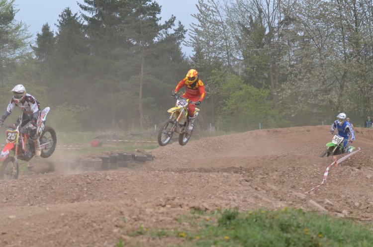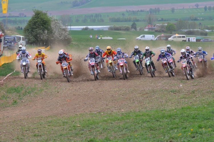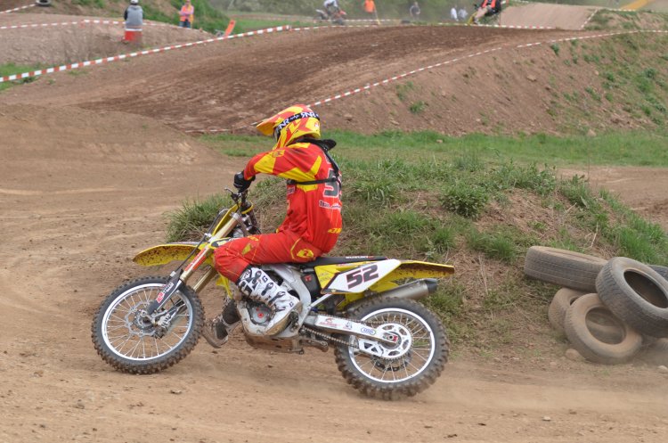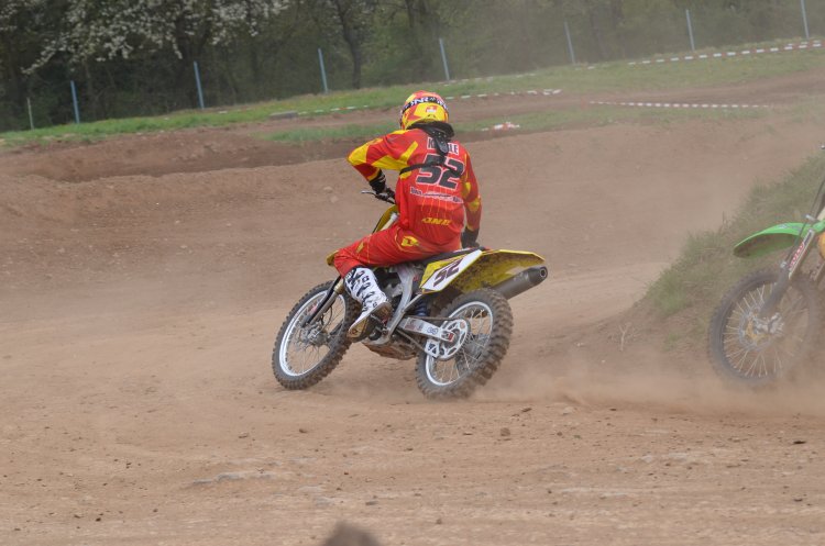 Nach der 5-Skunden Tafel im ersten Lauf fiel dann auch das Startgatter, zumindest bei allen bis auf meines: das wurde nämlich von meinem Vorderrad gehindert, bis auf den Boden zu fallen! SUPER, ich dem Feld hinterher gehetzt, das bereits schon einige Kurven weg war. Und nicht genug, dass mein Start total in die Hose ging, hat es mich bei der Rechtkurve auf die Startgeraden auf die linke Böschung getrieben und ich einen High-Speed-Mega-Highsider hingelegt. Und als wäre es noch nicht genug SCH.... gewesen, blieb die Maschine auch noch auf meinem Rücken liegen. Nachdem ich alles wieder sortiert hatte, war auch Achim schon da und half mir den Lenker etwas auszurichten. Ich bin dann zwar das Rennen mit einem konstanten Lenkeinschlag fertiggefahren, aber mit 1-1/2 Runden Rückstand war nicht mehr als der 27. Platz drin - also ein Nuller.